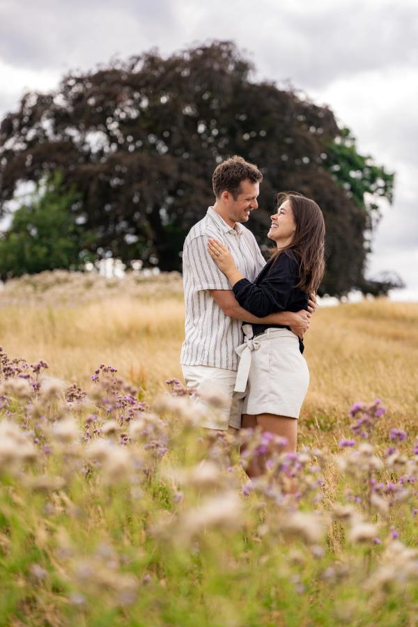 Sam proposed at Hampstead Heath Park in London, England, we had just taken a seat on a bench when, out of nowhere, Sam dropped to one knee. I barely had time to react before a photographer jumped out to capture it all! I was stunned, in the best way possible. it was emotional, exciting, and totally us. we ended up taking photos around the park for the next two hours, still grinning from ear to ear. photographer @weddingsbychino