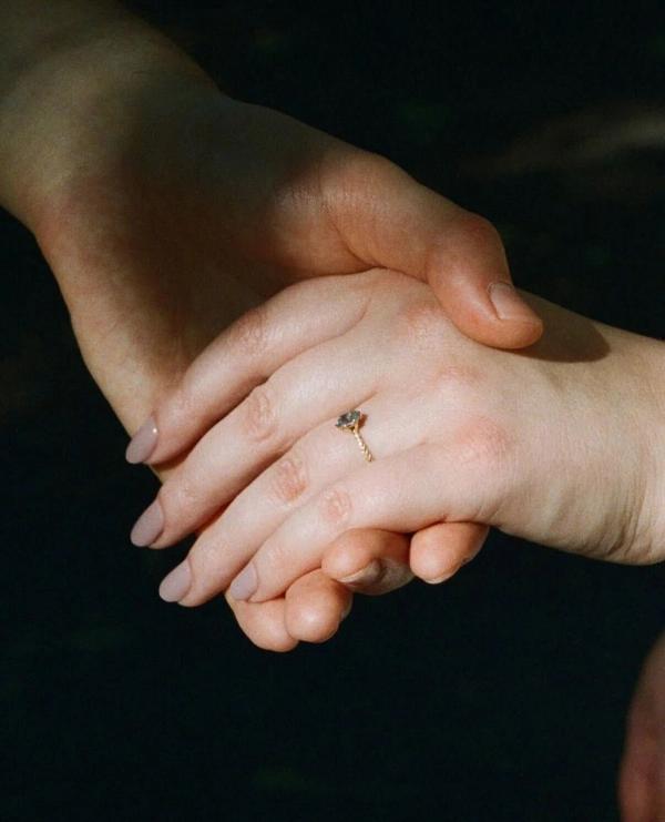 i spent a lot of time looking at different styles and consulting torie’s close friends and sisters. i wanted something unique (like her), something delicate and vintage-looking without being too ornate. of course, i knew she loved bluboho—so i creeped the store’s insta on the regular. i came across this one-of-a-kind sapphire ring and felt it checked all the boxes. i love how it changes colour under different lighting, just like torie’s eyes— blue to green.