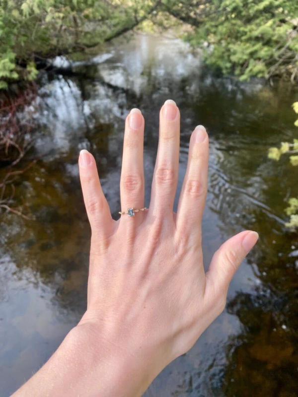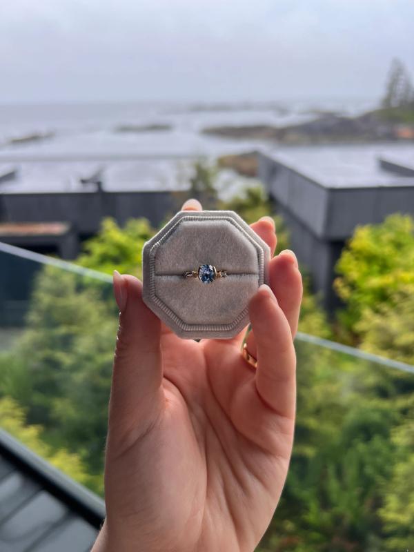 we had been talking about going to Vancouver Island for a few years, always knowing it would be a special trip. we were at the Nami Project in Ucluelet, curled up on the couch, watching the sun set over the waves when I said I want to do this forever. chris replied that he was just about to say the same thing and then pulled out the ring. the sapphire shifts colour in the light - going from bright blue to almost clear. it feels like a piece of us that has been made into something tangible.