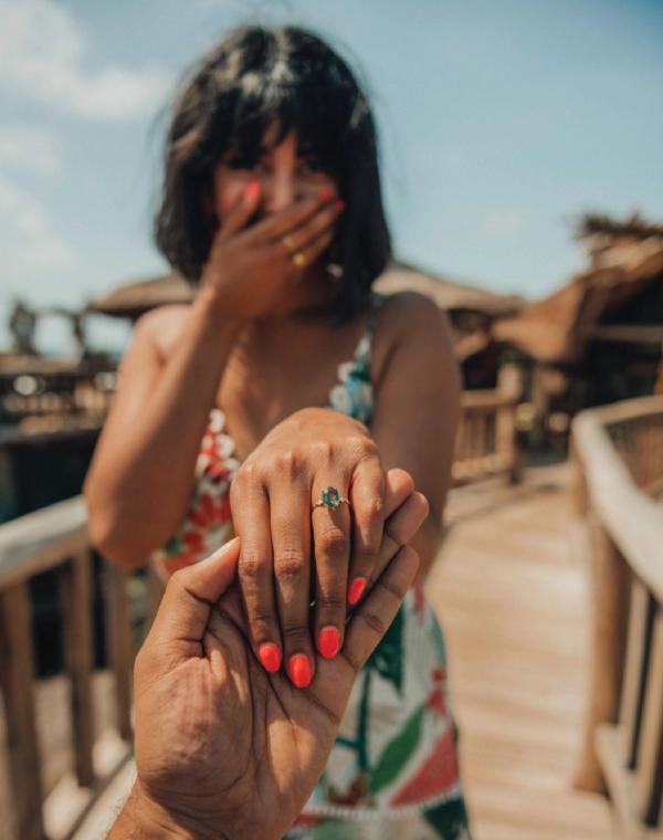 i’d gone to so many places to try on rings, but i loved bluboho because i didn’t want something too traditional— and because the rings you carry are just special. as soon as i tried on my ring, nish’s jaw dropped. i think the green is so beautiful, it’s perfect for my skin tone. i didn’t realize he’d bought it, so i was so excited when he presented me with it in tulum. honestly i can’t imagine a ring more suited to me, i feel like it captures my essence and our relationship perfectly.