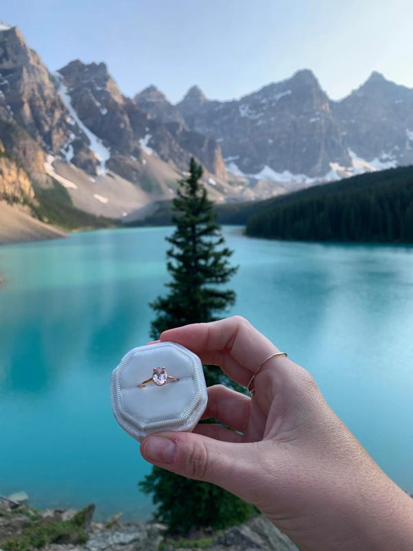 all my bluboho pieces mark a special moment in my life, so when it came to picking out my ring, sam knew it had to come from bluboho. i had not-too-subtly been dropping hints for some time— meanwhile, my peach sapphire was being hidden from me in sam’s tool kit. sam popped the question at my cottage surrounded by my family and our dog, jazz. i am so in love with my one-of-a-kind ring, it is everything i wanted and more.
