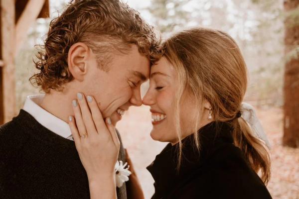 emily & john is wearing reverie sapphire beloved band
