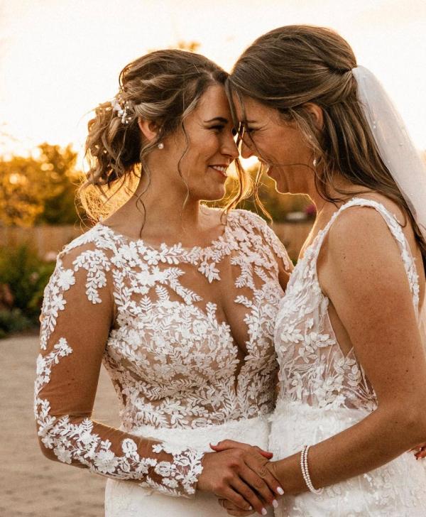 melissa is wearing the moonbow and ablaze wedding bands